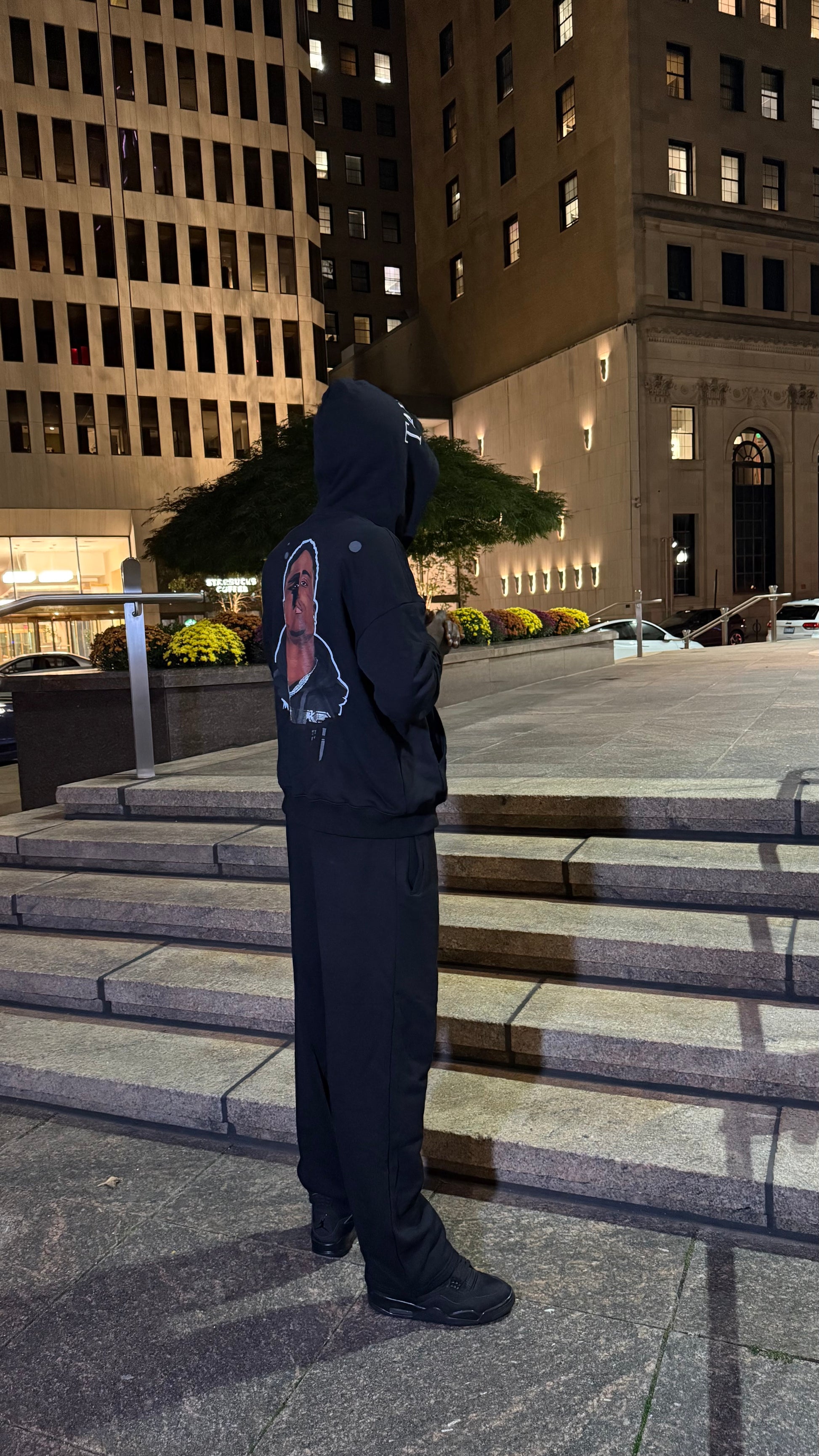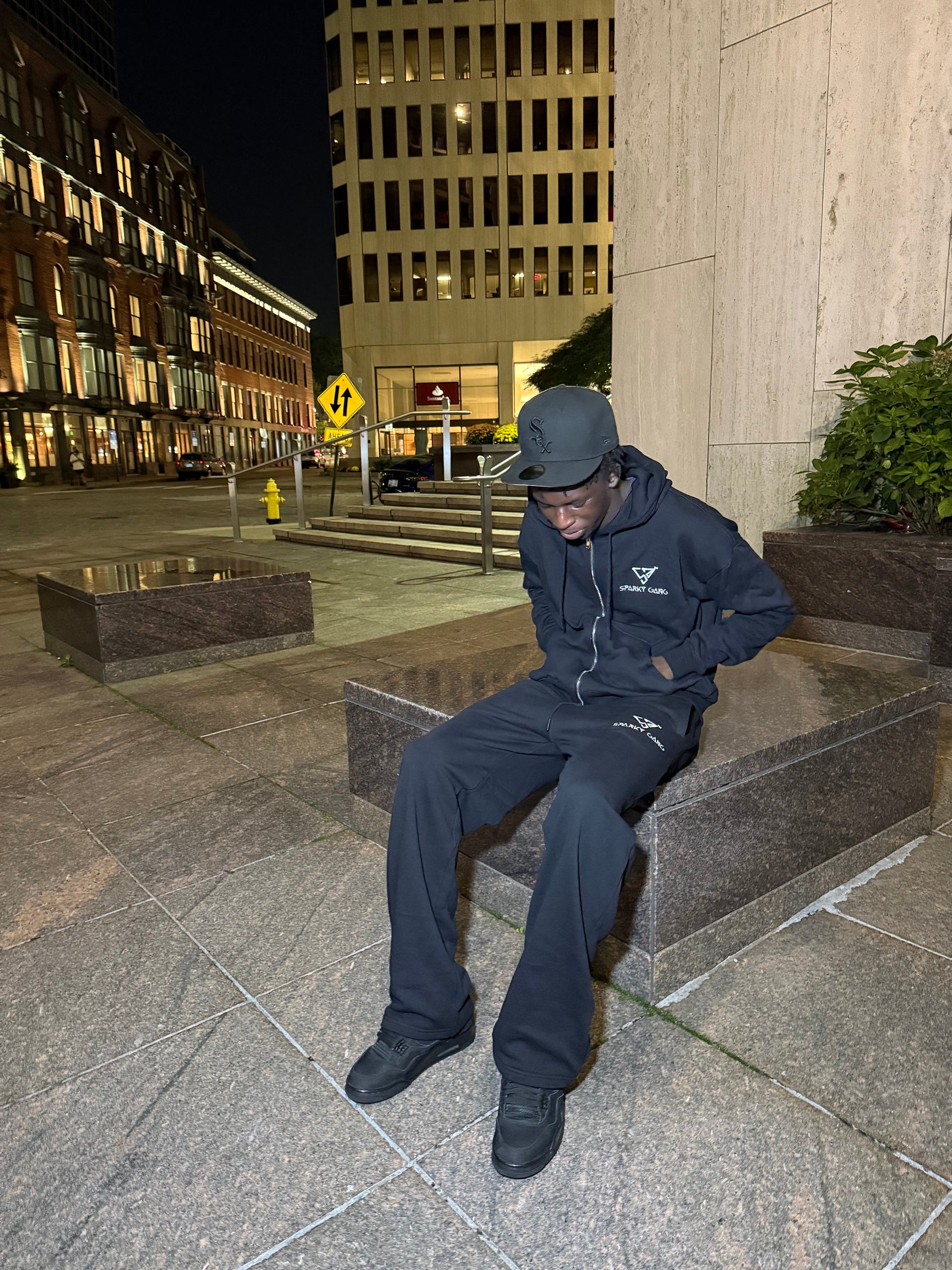 The Classic all-black Sparky Zip-up track suit set with puff print outline hood logo and clean embroidery. Smooth terry texture for all-day comfort.